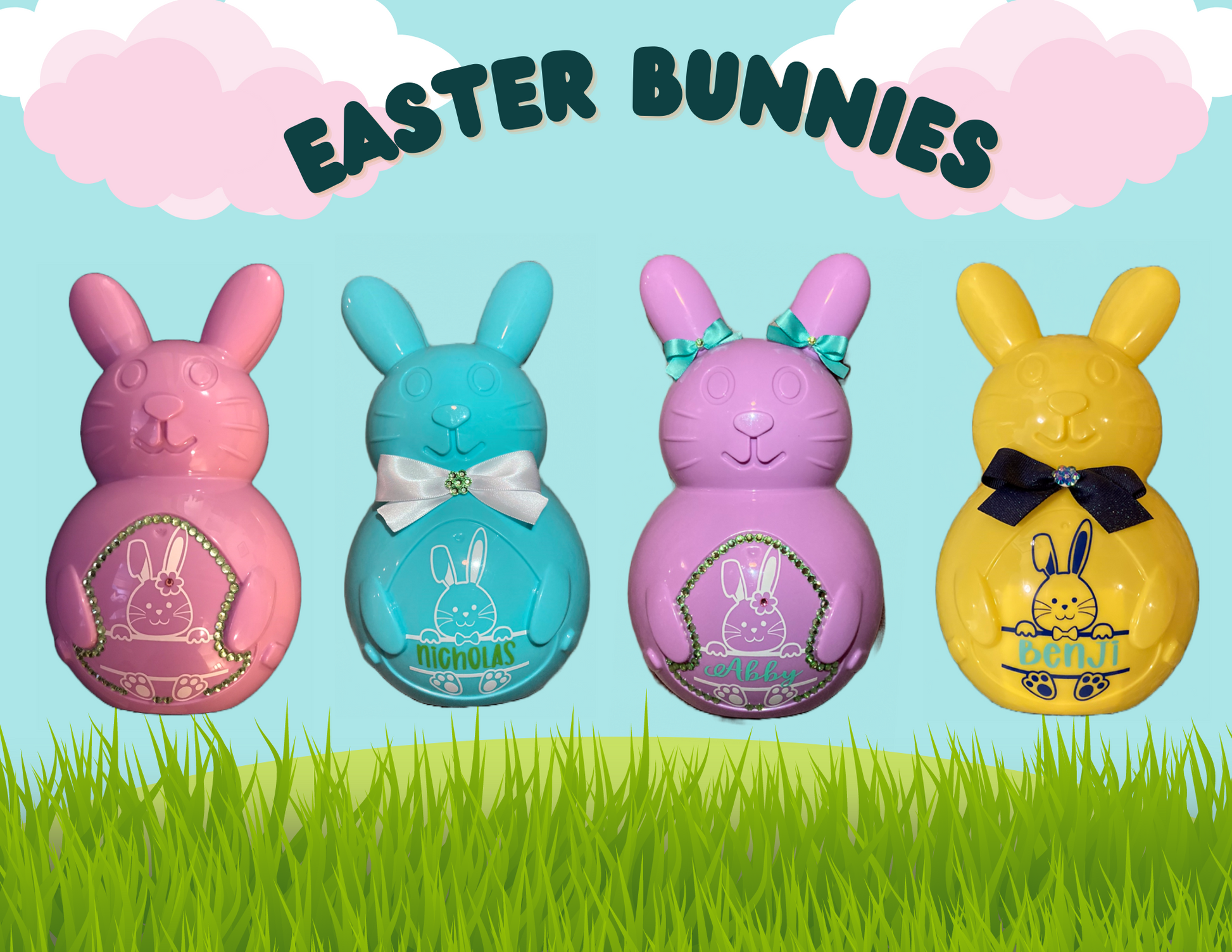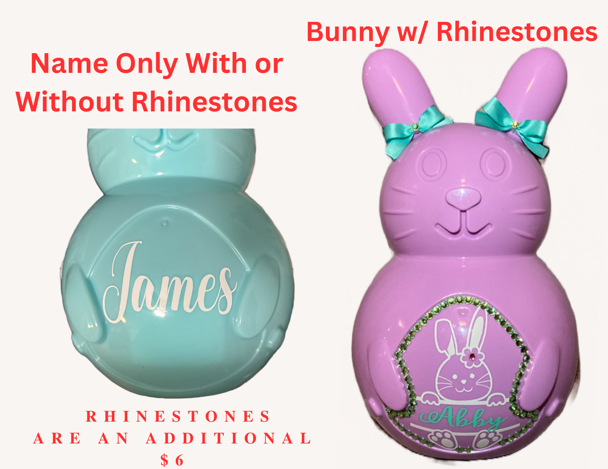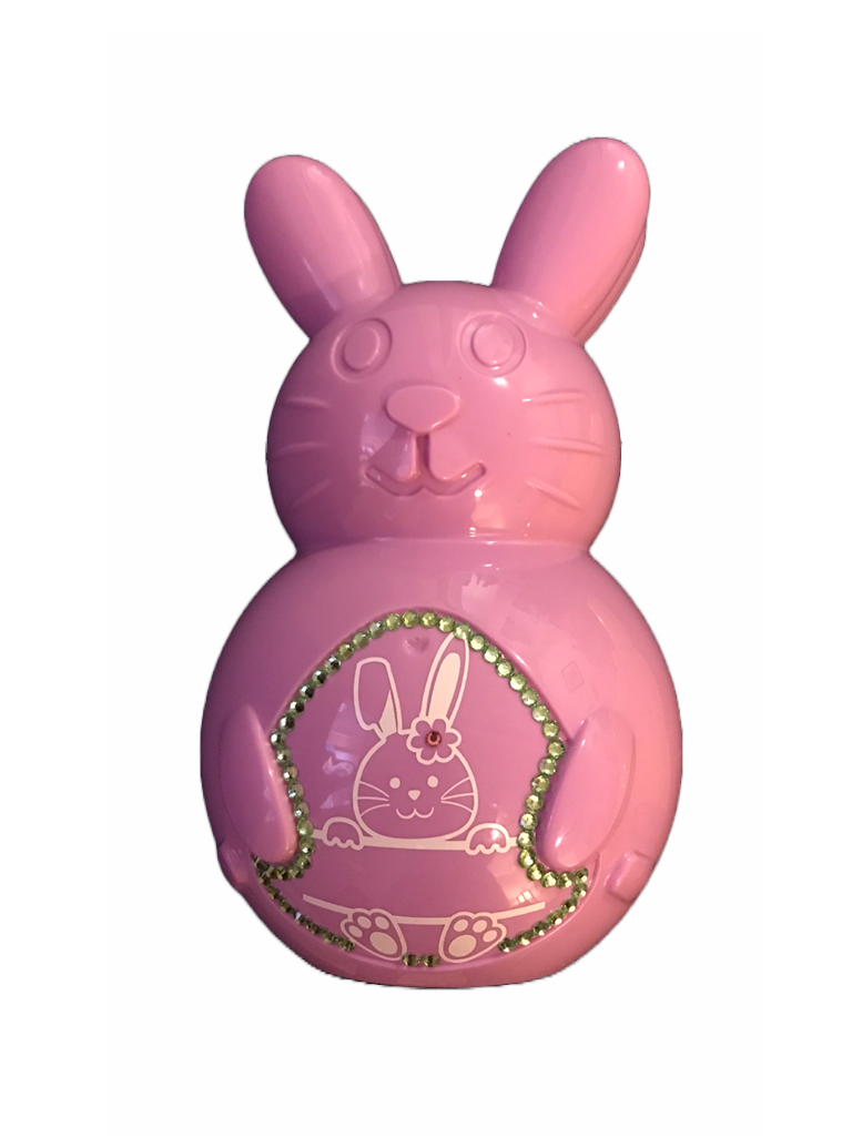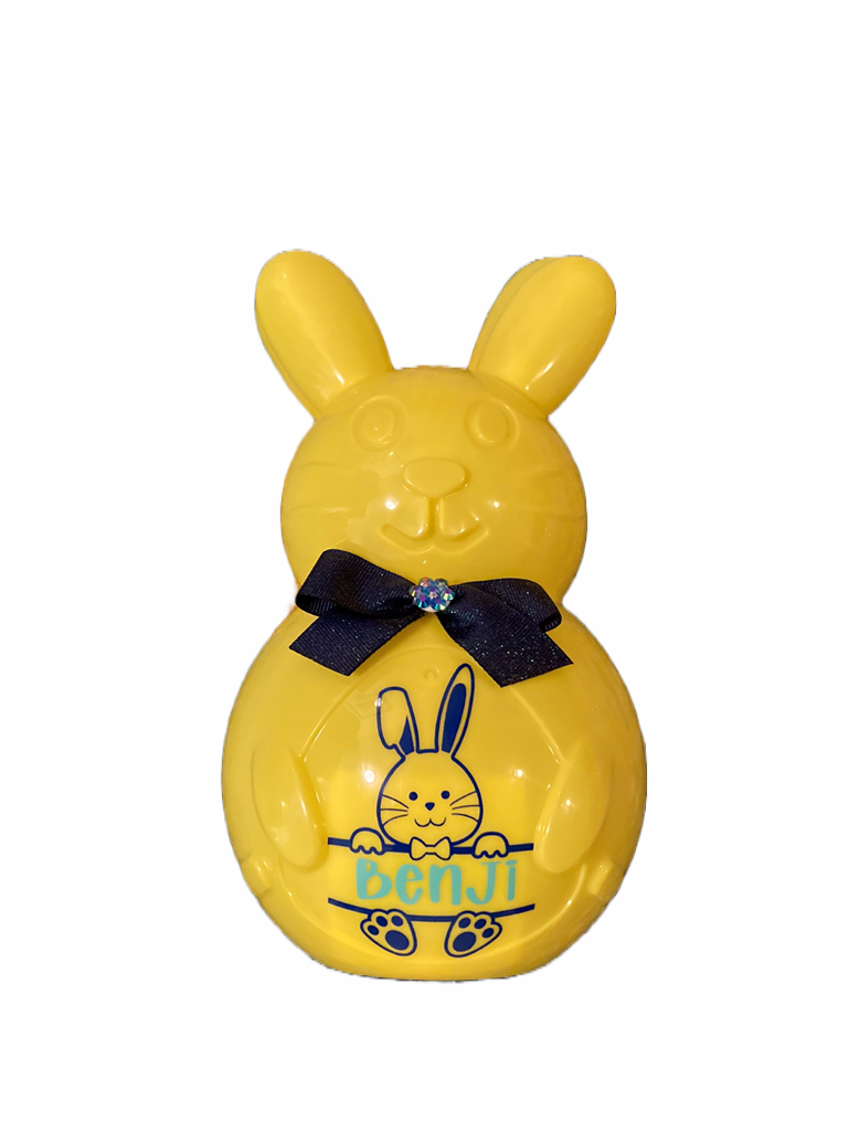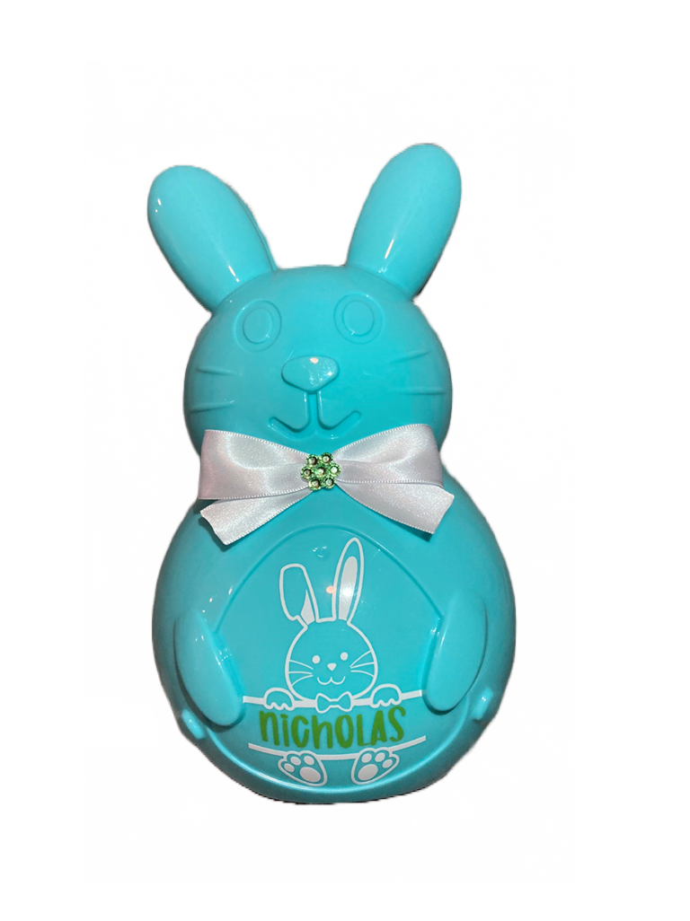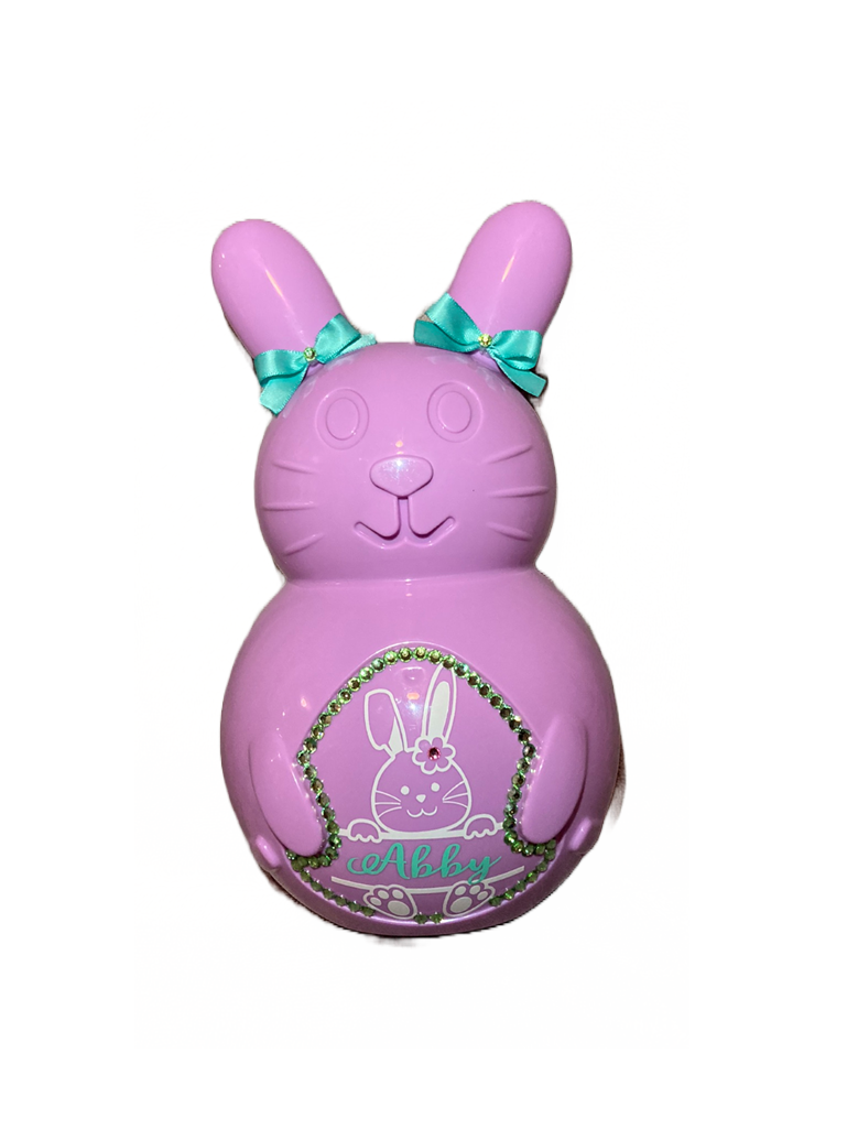 Easter Bunnies are ready for you to fill with small gifts and treats. Bunnies are 10 inches tall (Fillable area appox. 8" x5"). These Bunnies are perfect for candies, gift cards and small items. Each bunny is complete with the personalized name requested, a choice of bowtie or hair bows. Rhinestones lining the bunnies belly are an additional $6.00.